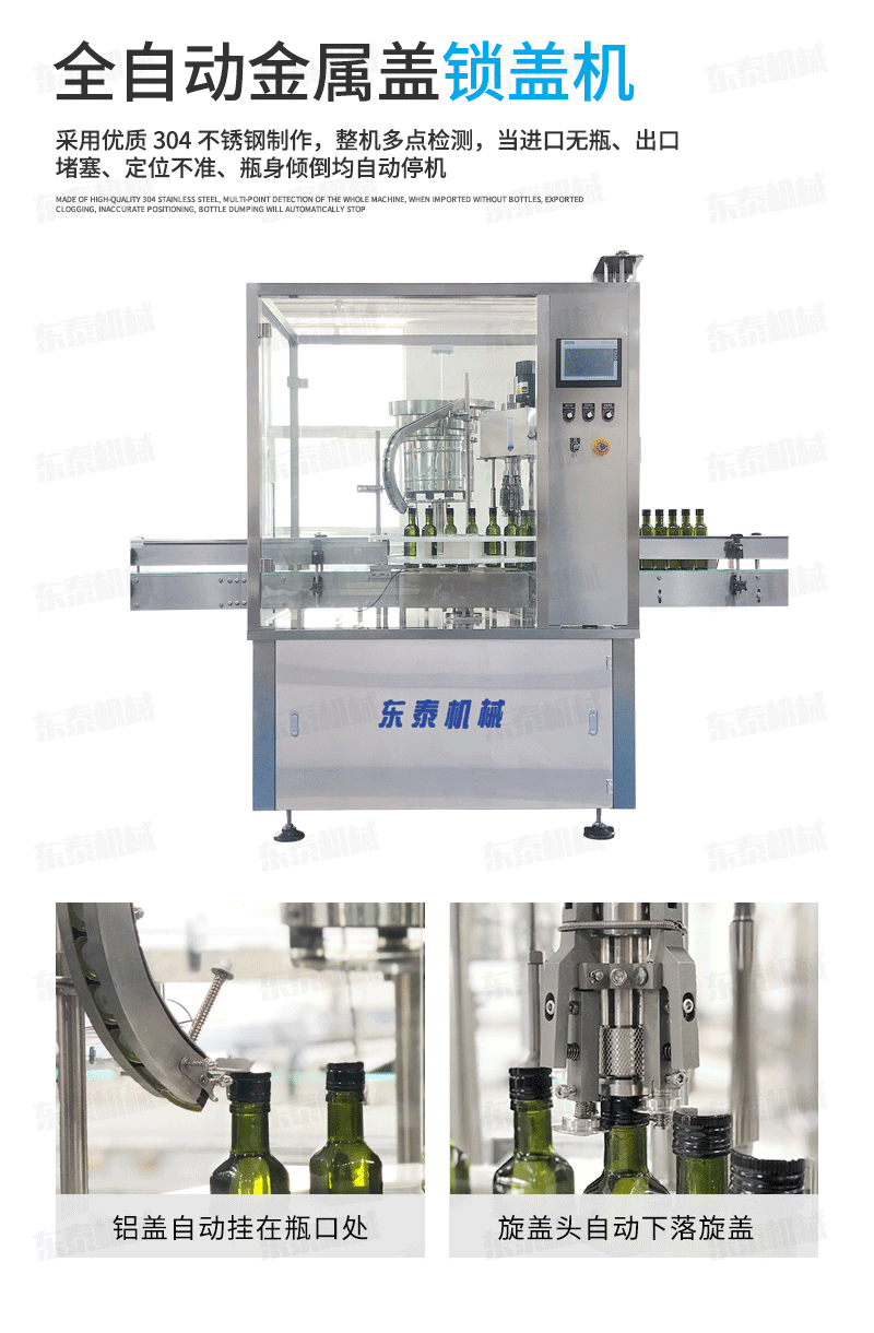 該部分利用鏈板輸送帶將瓶子依次輸送至定位卡盤,自動檢測瓶,當被鎖口(或旋蓋)瓶到達落蓋滑道正下方工位時,鋁蓋自動掛在瓶口處。瓶子由旋轉卡盤輸送至打蓋裝置工位時,打蓋裝置將瓶蓋及內塞打緊,再由旋轉卡盤將瓶子輸送至旋蓋工位,旋蓋頭自動下落旋蓋、鎖螺紋,再由旋轉卡盤將鎖蓋輸送至直線輸送帶上,從而完成整個工序;
