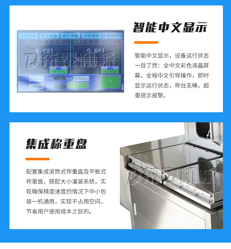 5. 該設(shè)備配備四頭(大小兩組)雙泵,凈重/毛重、自動(dòng)/手動(dòng)功能一鍵切換,進(jìn)一步滿足客戶精度,速度,低投資需求。