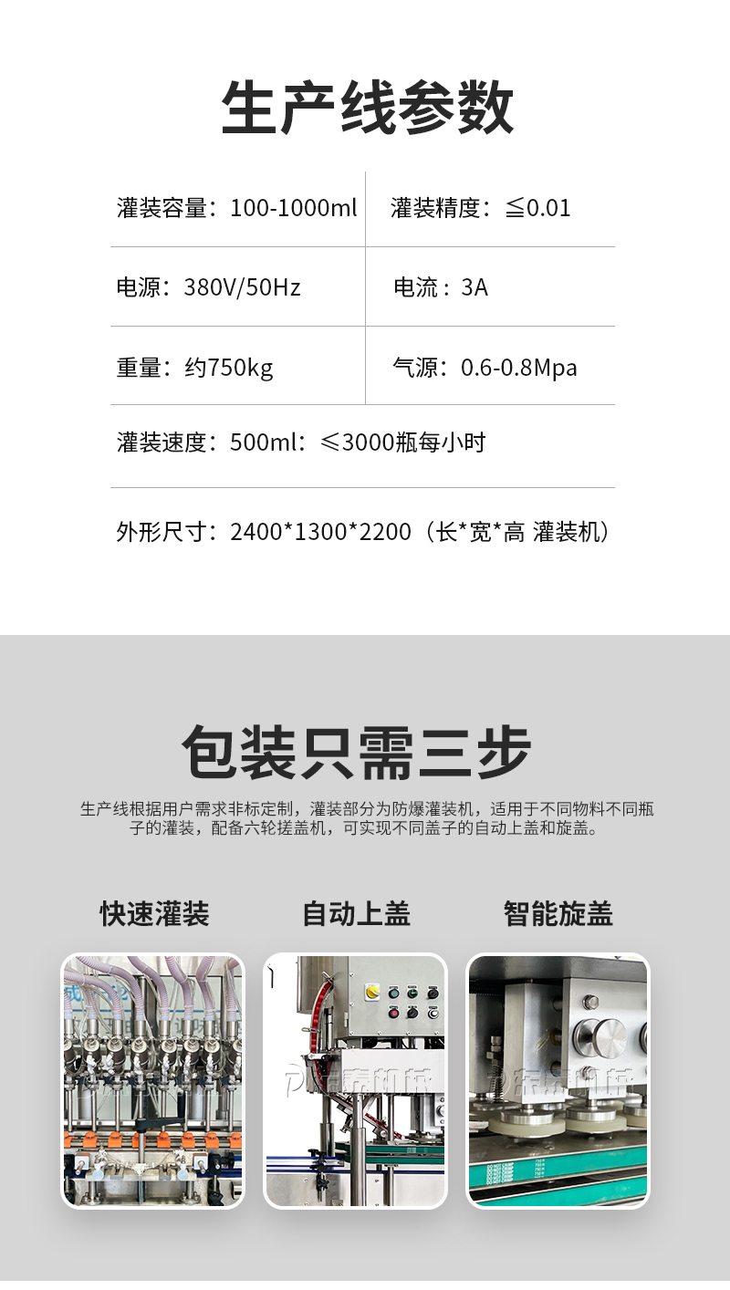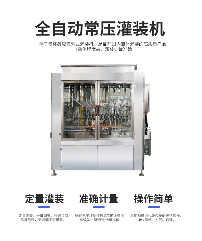電子量杯感應(yīng)直列式灌裝機(jī),是目前國內(nèi)液體灌裝的高端產(chǎn)品,自動(dòng)化程度高,灌裝計(jì)量精確,適用于塑料瓶、玻璃瓶等各種幾何形狀的瓶型的不含氣體的酒水、飲料、調(diào)味品及其他溶液的定量灌裝。機(jī)器采用觸摸屏代替?zhèn)鹘y(tǒng)的按鈕操作,操作簡單、方便、直觀?萍己扛摺C(jī)器灌裝計(jì)量可通過觸摸屏對(duì)灌裝時(shí)間的調(diào)整實(shí)現(xiàn)不同計(jì)量灌裝,方便操作者使用。