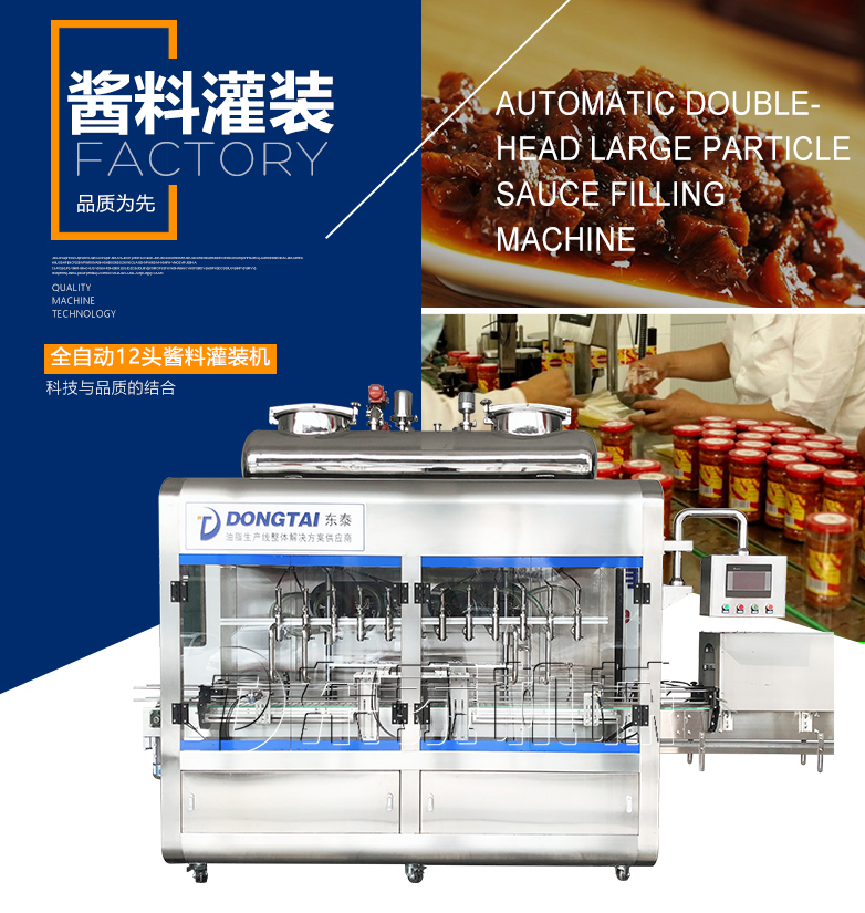 灌裝機(jī)采用活塞式灌裝原理,適用于調(diào)味品中帶顆粒并且濃度較大的辣椒醬、豆瓣醬、花生醬、香菇醬、果醬、牛油火鍋底料、紅油火鍋底料、蝦醬等較為粘稠醬類的灌裝。