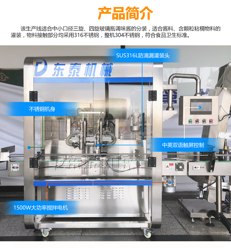 東泰機(jī)械通過十多年的努力和發(fā)展,現(xiàn)已成為集科研、設(shè)計(jì)制造、成套供應(yīng)、技術(shù)咨詢服務(wù)、工程總承包為一體的高科技型企業(yè)。如今專業(yè)的東泰技術(shù)團(tuán)隊(duì)根據(jù)醬料市場研發(fā)推出的牛肉醬定量灌裝機(jī)設(shè)備得到市場的認(rèn)可和用戶的青睞。同時(shí)這款自動化、智能化、效率化、功能化的醬料灌裝機(jī)械設(shè)備帶領(lǐng)著醬料市場進(jìn)入規(guī)模化的生產(chǎn)領(lǐng)域中,為相應(yīng)企業(yè)提供方便、快捷、省時(shí)省力的現(xiàn)代化快節(jié)奏的發(fā)展。如果您有需求,歡迎您到東泰機(jī)械實(shí)地考察選購!
