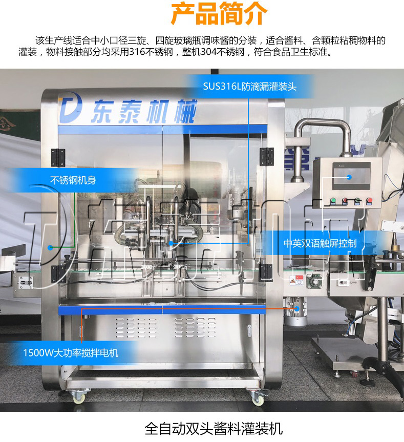 該機(jī)為全自動(dòng)醬類灌裝機(jī),配有自動(dòng)攪拌功能,使物料混合更加均勻 ,有效的解決灌裝誤差大的問(wèn)題;本機(jī)輔料添加料可調(diào),精準(zhǔn)方便,提高自動(dòng)化程度。 醬類灌裝機(jī)氣動(dòng)部分均采用氣動(dòng)元件,壽命長(zhǎng),穩(wěn)定。 物料接觸部分采用SUS316L不銹鋼材料制成,符合食品醫(yī)藥安全衛(wèi)生要求。 灌裝閥由氣動(dòng)閥控制,灌裝精度更高。 灌裝量和灌裝速度均可任意調(diào)節(jié)。 灌裝頭是我公司創(chuàng)新的灌嘴,可有效解決拉絲、滴漏問(wèn)題. 該醬類灌裝機(jī)大小瓶調(diào)節(jié)方便,配置自動(dòng)升降裝置。 采用集成理念設(shè)計(jì),易損件少,方便企業(yè)維護(hù)保養(yǎng)。 該全自動(dòng)醬類灌裝機(jī)設(shè)有無(wú)瓶不灌裝功能,不需更換零件,即可快速調(diào)整各種不同形狀規(guī)格的瓶子。